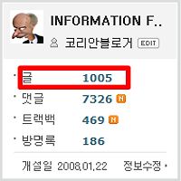 | 코리안블로거의 1,000포스트 달성에 즈음한 회고 (19) | 2009.11.04 |