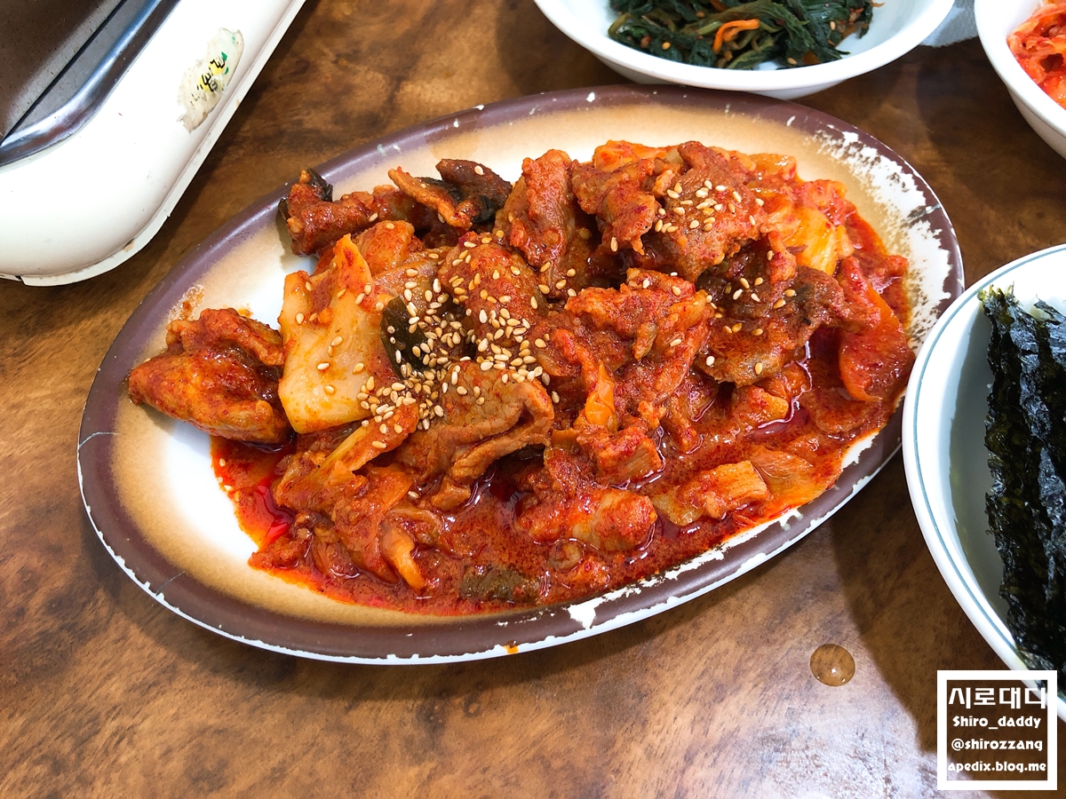 점심엔 김치찌개, 오징어볶음, 제육볶음 등의 메뉴를 팔고, 저녁엔 삼겹살도 파는 곳