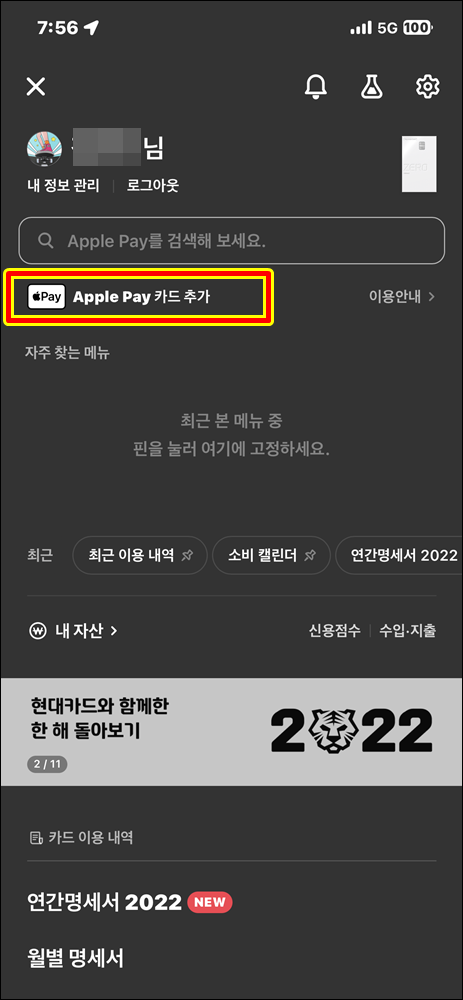 기존에 현대카드는 가지고 있지 않아 애플페이 사용을 위해선 현대카드 발급이 필수인거죠.